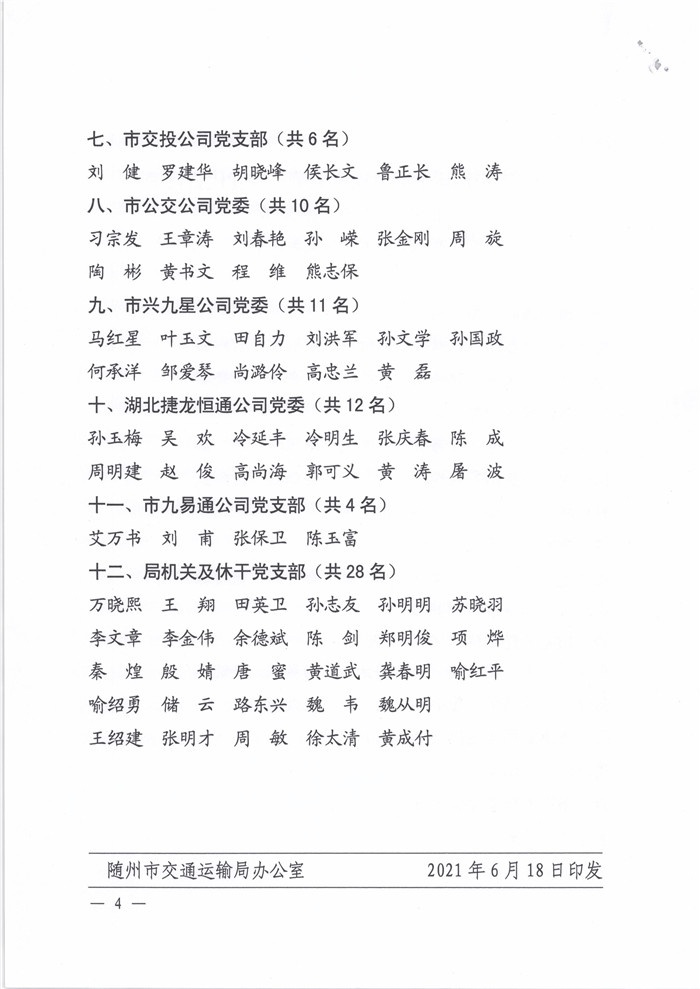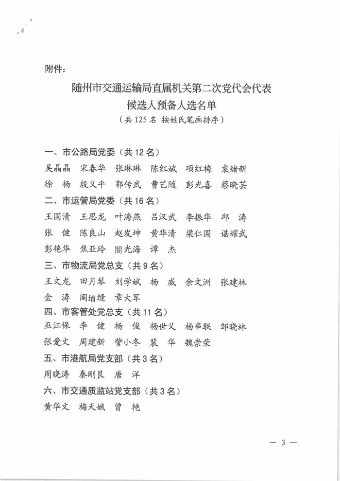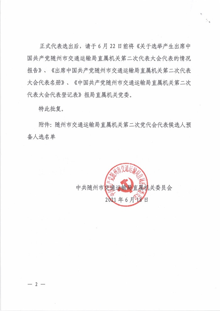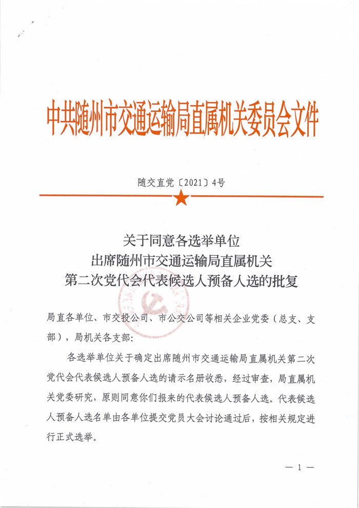 關(guān)于同意各選舉單位出席隨州市交通運(yùn)輸局直屬機(jī)關(guān)第二次黨代會(huì)代表候選人預(yù)備人選的批復(fù)
